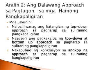 PAMANTAYAN SA PAGKATUTO Naipaliliwanag ang katangian ng top-down approach sa pagharap sa suliraning pangkapaligiran Nasusuri ang pagkakaiba ng top-down at bottom-up approach sa pagharap sa suliraning pangkapaligiran Nakabubuo ng konklusyon sa angkop na approach sa pagharap sa suliraning pangkapaligiran. TOP-DOWN APPROACH KAHULUGAN KALAKASAN KAHINAAN. Ang katangian nito nakaasa sa pamahalaan ang gagawing plano kung paano maiiwasan ang sakuna.