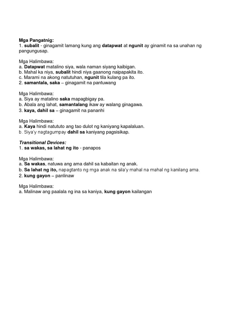 Mga salitang magkaparehong baybay ngunit magkaiba ng kahulugan. Walan dipresnsiya sa akin maging si Jose ang magwagi sa paligsahan. Subalitdatapwatngunit- ginagamit upang ipakita ang kaibahan ng unang kaisipan sa ikalawang kaisipan.