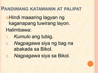 Naipapahayag ito sa pamamagitan ng paggamit ng panlapi sa pandiwaation. Nanguha ng buko ang kuya para sa iyo. Nakasusulat ng sariling halimbawa ng biro bugtong at palaisipan.